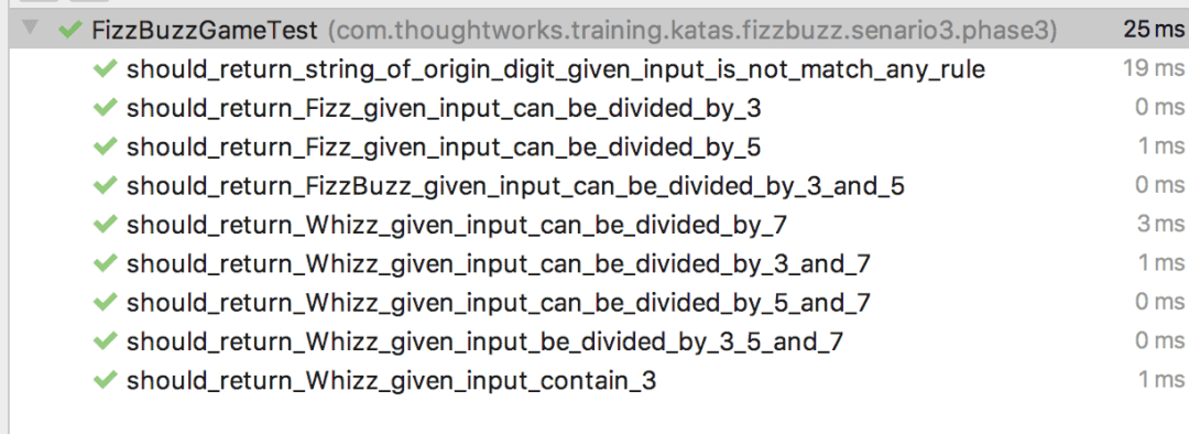 public void should_return_Fizz_given_input_can_be_divided_by_3 () {...}对应的,我们的名字的结构搬到我们的代码上,三段式表达,given 部分还是输入,when 部分就是被测函数,然后 then 部分写各种 assertion 来校验。