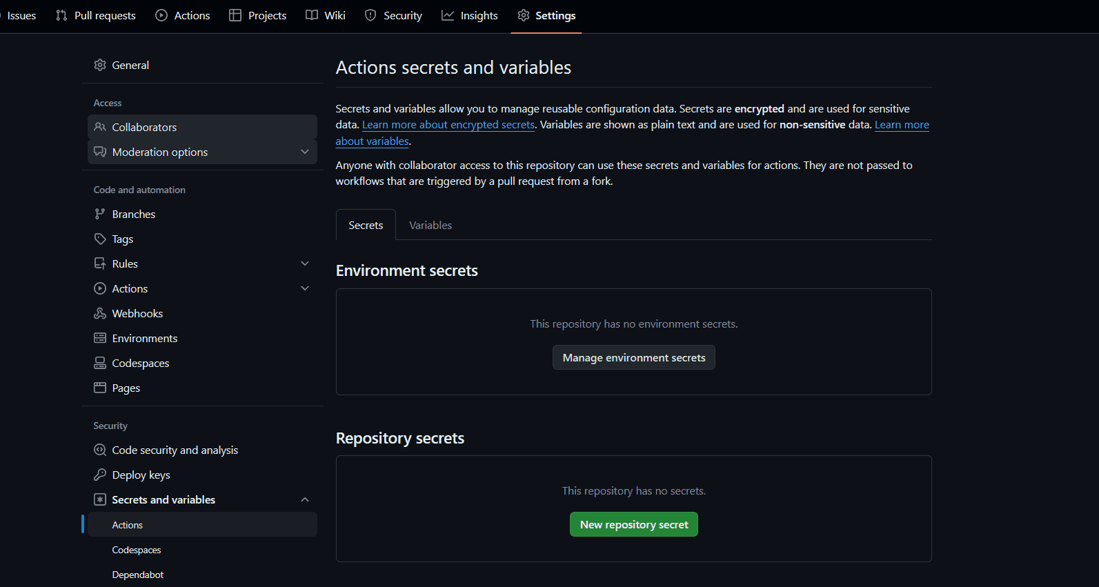 复制刚刚创建的 token,到仓库的 Settings > Secrets and analysis > Actions,点击 Repository secrets 的 新建按钮