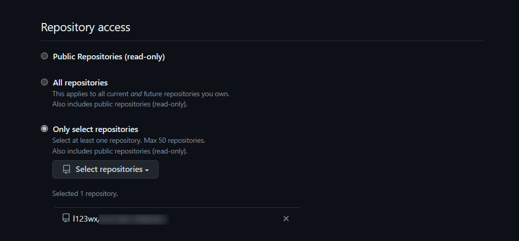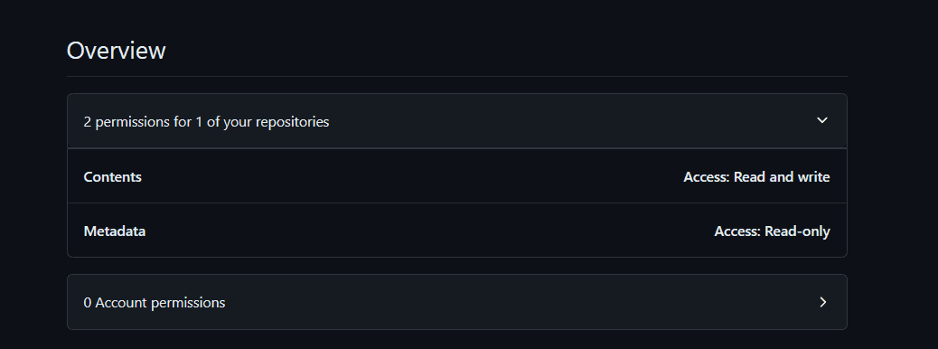 因为只需要 git push 的权限,所以只需要将 Repository permissions > Contents 设置为 Read and write 就行了