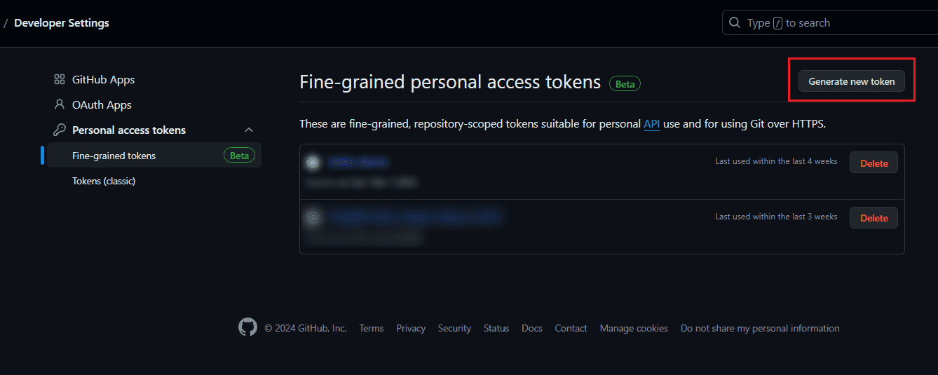 右上角点击头像 > Settings > Developer Settings > Personal access tokens > Fine-grained tokens,点击 Generate new token 按钮新建一个 token