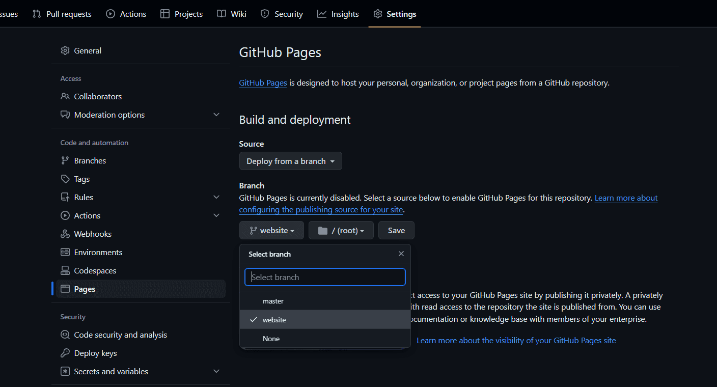 在仓库的 Settings > Pages 里将 Branch 设为刚刚新建的 website 分支,点击 Save 保存修改