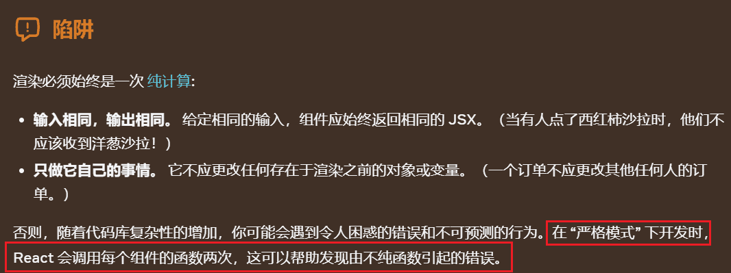 React 将更新分为渲染和提交[两个阶段](#React 何时添加 refs),渲染阶段会执行组件代码计算 jsx,这里对纯函数的要求也是对于这一阶段来说的,要求组件函数在相同输入的时候必须输出相同的 jsx。
