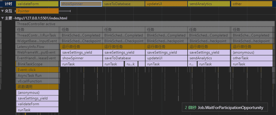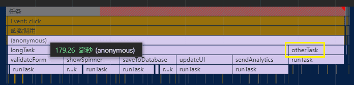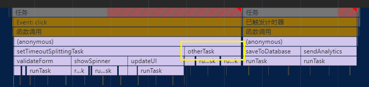 可以看到,长任务被拆分成了五个短任务,并且被设置为低优先级的 saveToDatabase 任务被放到了 updateUI 任务后面执行