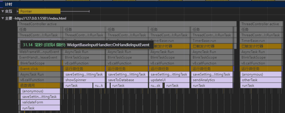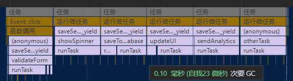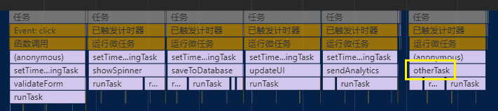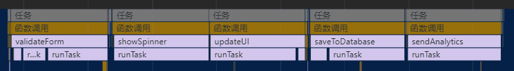 仔细看上面的两个火焰图可以发现,我使用黄色框标注了一个 otherTask 任务。这个任务在 saveSettings 任务后面执行,并且预期希望在 saveSettings 的所有子任务执行结束之后才执行 otherTask。